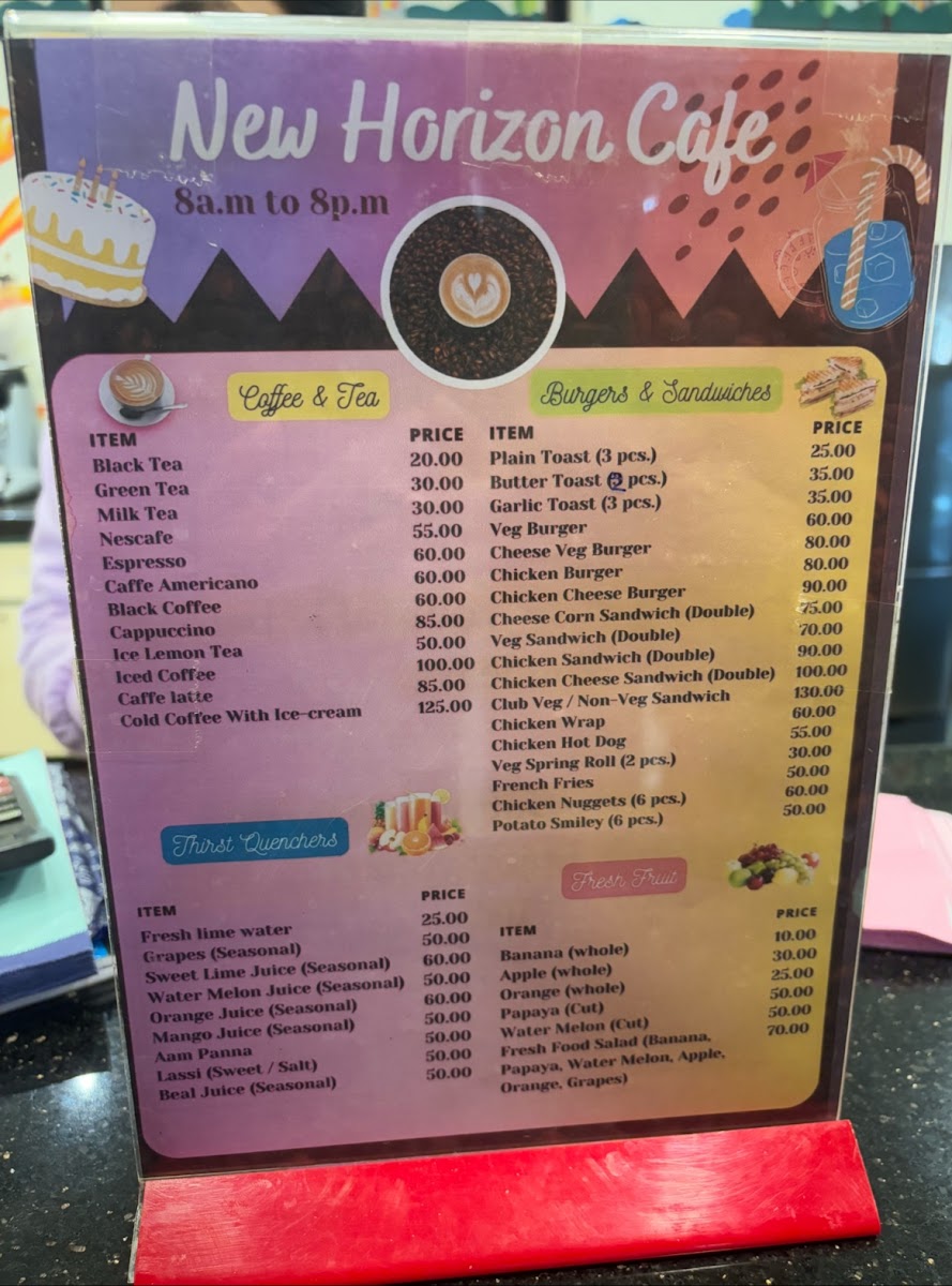 The menu at New Horizons Cafe offers a variety of options suitable for breakfast, coffee breaks, and light meals. It features categories including fresh fruits, snacks, savory dishes, soups, noodles, and baked items.